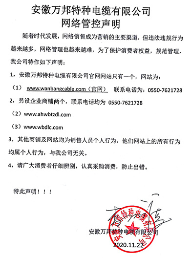 鄭重聲明:安徽萬邦特種電纜有限公司官方網站為:www_wanbangcable_com.proformavideo.com,除此之外無任何子網站或合作網站,其余均為假冒偽劣。電話:0550-7621728 13485756353 地 址:安徽省天長市滁州高新技術產業開發區經四路29號